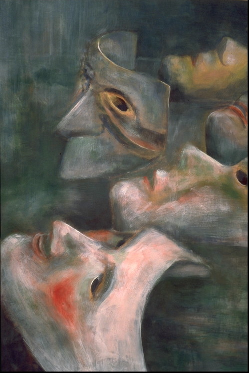 Bei diesem Bild kann man den Entwicklungsprozess von realen Masken über die Komposition des Bildes "Masken" bis zum fertigen Bild verfolgen. Es wurde mit Acrylfarben auf Papier gemalt. letztes update:14.12.25