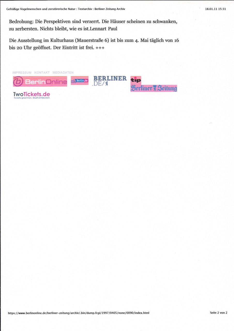 Die Erde bricht auf. Menschenköpfe rollen in eine Spalte, werden eingesogen, verschlungen. Niemand entkommt der Naturgewalt. "Erdrutsch" heißt das Bild, das 1987 entstand. Daneben hängt der "Vogelmensch" - menschlicher Körper und gefiederter Kopf. In seinem aufgeblähten Bauch drängen sich Männer und Frauen. Ihre Gesichter blicken ins Leere. Sie sind verloren und scheinen es nicht einmal zu merken. "Diese Werke habe ich bisher selten ausgestellt", sagt der Maler, der es auf 40 Ausstellungen pro Jahr bringt. Vielen Besuchern machen meine Traumbilder Angst. Und die Stadtansichten verkaufen sich natürlich besser. Ihm selbst sind seine phantastischen Visionen aber wichtiger. Die Bilder sind sehr persönlich. Manchmal frage ich mich, ob ich das überhaupt zeigen kann. Denn da präsentiere ich wirklich meine Gefühle. Sterzenbach sieht sich als gespaltenen Künstler. Er braucht seine surrealen Motive als Befreiung von den peniblen Stadtbildern. Auch auf anderem Gebiet hat Heinz Sterzenbach sein Leben geteilt. Der 55jährige arbeitet halbtags als Internatslehrer auf der Insel Scharfenberg. Die restliche Zeit zieht er sich ins Atelier zurück. Nicht alle der jetzt gezeigten Werke sind grausam und hoffnungslos. Bei den "Stammesriten" tanzen Massai-Krieger in Kriegsbemalung. (Leonart Paul, Berliner Zeitung 5./6.4.97, Spandauer Rundschau, Seite1 und Seite 2)