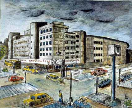 Blick vom Café Möhring aus auf die Straßenkreuzung Kurfürstendamm / Wilmersdorfer Str. Kleiner Dreieckplatz, U-Bahnhof. 1973 nach dem ehemaligen Bundeskanzler benannt. Im Rahmen der Untertunnelung des Kurfürstendammes 1974 neu angelegt mit Pflasterung, Baumbestand, Sitzbänken. Im Zentrum Brunnenskulptur "Säule in der Brandung" (Chromnickelstahl, flaches Rundbecken aus Stein) von Brigitte und Martin Matschinsky-Denninghoff. An der Ecke Kurfürstendamm 70 / Lewishamstraße das schmalste Bürogebäude Berlins.