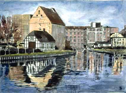 Die südlich vom Humboldt-Schloss gelegene Mühle wurde erstmalig 1361 erwähnt. DieTegeler Mühle oder auch Victoria-Mühle genannt, war immer die bedeutendste Mühle im Bezirk. Schon im 14. Jh. stand sie in der Mahlleistung an zweiter Stelle aller Mühlen auf dem Barnim. Für den Landesherren war sie eine bedeutende Quelle für Steuereinnahmen. Hinter der Mühle lagen die Raubritter der Quitzows im Jahre 1410 im Hinterhalt, um die Verfolger aus Berlin zu überraschen. Die kurze Schlacht, die daraufhin entbrannte, gewannen sie und danach zogen sie mit den geraubten Berliner Rindern vondannen. Es folgten zahlreiche Besitzerwechsel, bis sie 1776 durch den Kauf von Major v. Humboldt zum zweiten Mal unter Tegeler Gutsherrschaft gelangte. Im Laufe der Zeit wurde die Mühle immer mehr modernisiert, bis sie von knapp 100 Jahren eine 1000 PS-Dampfmachine bekam und vom Wasser des Fließes unabhängiger wurde. Von dem ursprünglichen Mühlengebäude ist nach einer Vielzahl von Bränden und Um- und anbauten nichts mehr zu sehen. Schon 1848 wurde die alte Wassermühle durch einen Umbau zur Dampfmühle wieder konkurrenzfähig gemacht, aber erst nach einem erneuten Besitzerwechsel wurde sie 1897 bedeutend vergrößert. Ein neues dreistöckiges Mühlengebäude, ein Maschinenhaus und zwei neue Speicher kamen noch hinzu. Glücklicherweise überstand die schöne historische Anlage den Zweiten Weltkrieg weitgehend unbeschadet und wurde 1989-92 unter denkmalpflegerischen Gesichtspunkten zu einem modernen Hotel- und Bürozentrum umgebaut. Heute befinden sich Büroräume verschiedener Firmen, ein Hotel mit Restaurant darin.