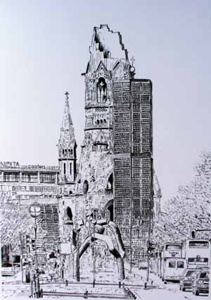 Nach der Bombennacht (23.11.1943) lag die Kirche in Trümmern. Die Reste der 65 m hohen Turmruine dienen heute als Mahnmal und Wahrzeichen Berlins. 1959-61 wurde der Ruine eine Kirche und ein Glockenturm hinzugefügt (Egon Eiermann).